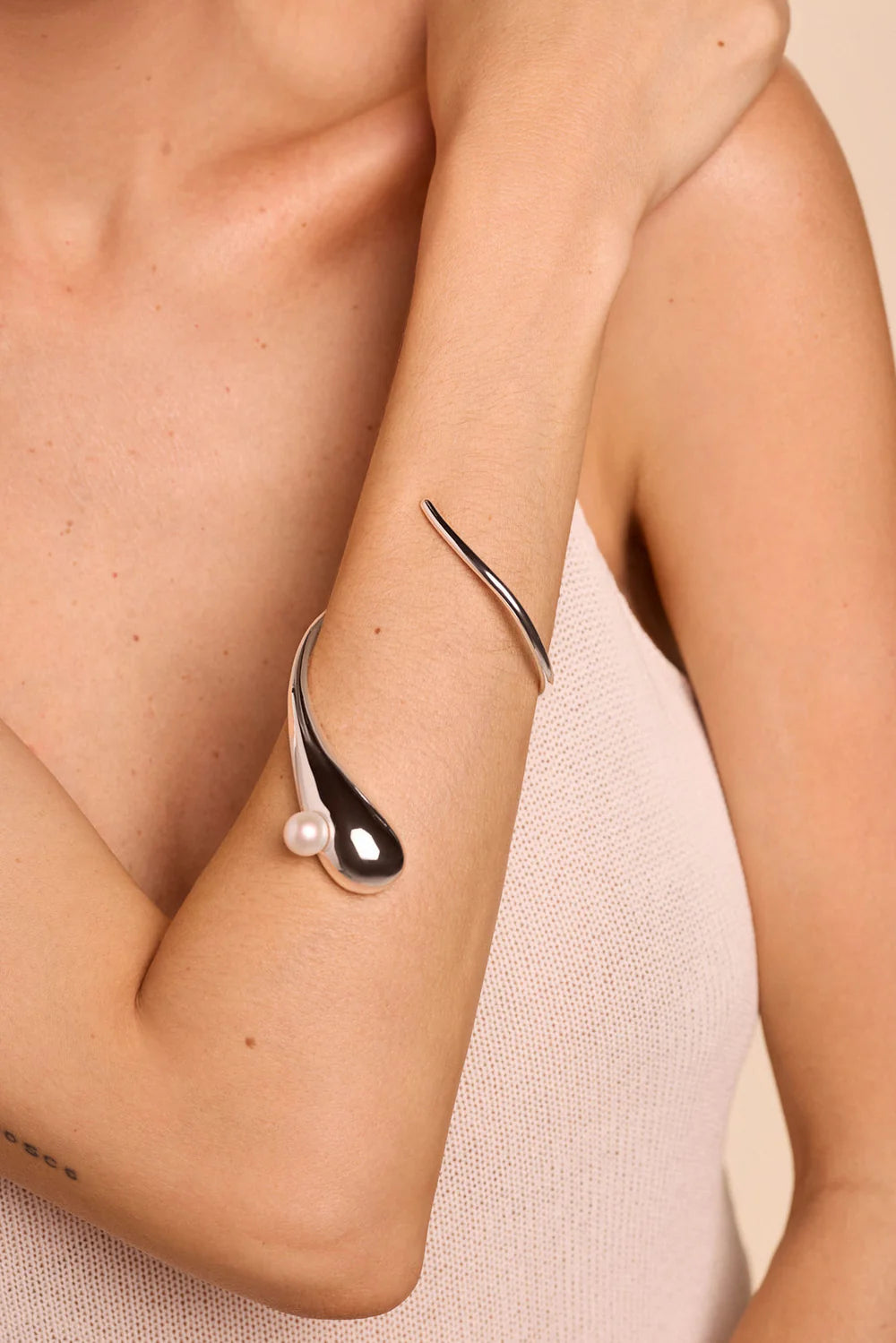 Delicata e morbida come gocce di rugiada che si posano sulle foglie all'alba. Questo bracciale presenta perle autentiche e un design in metallo ispirato alle gocce, rivelando una silhouette allungata e minimalista.